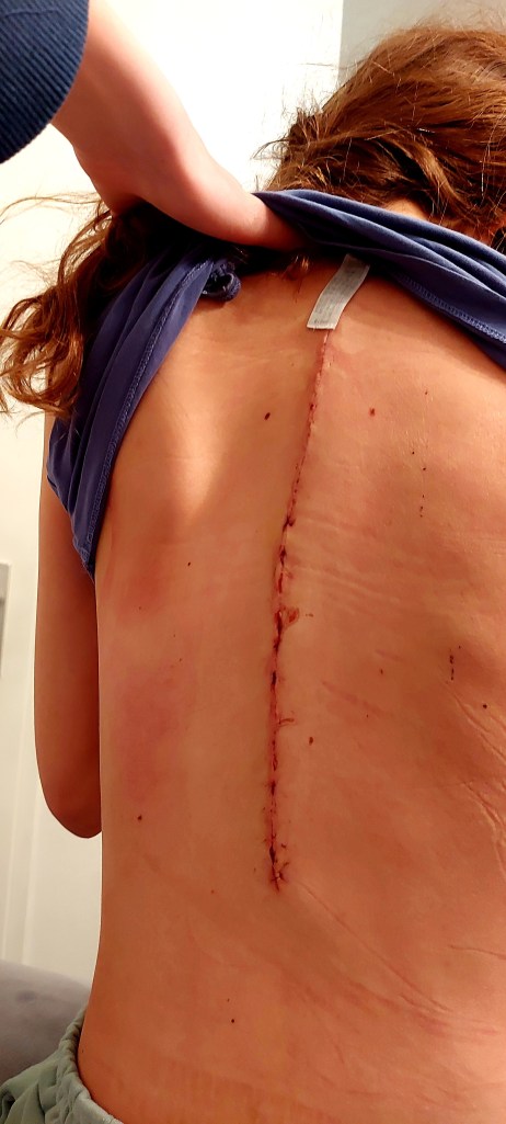 En wat een geluk. Ze heeft geen metaal in haar onder rug. Zij zal daarom tzt altijd kunnen bukken. Mooi meegenomen. Maar nu nog even niet. Laten we eerst het litteken maar rust gunnen, genezen.