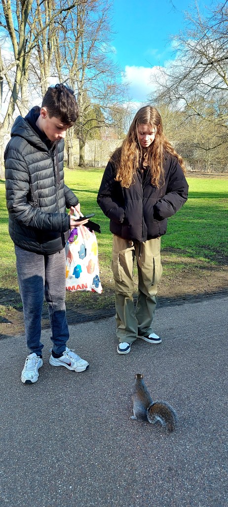 Onderweg zag ik een geit los lopen. Dacht ik. Dus ik riep naar Eva; look, it’s a goat outside. Mijn oom begon te lachen. Dat is geen geit, dat is een soort rendier. Die lopen hier door de hele wijk. Say what? Super leuk. Straks gaan wij wandelen. Kijken of we er een kunnen spotten. In de stad zagen we grijze eekhoorns in een park. Heel brutaal. Het liefst vloog hij onze boodschappen tas in. Eva wilde hem aaien. Doe maar niet.