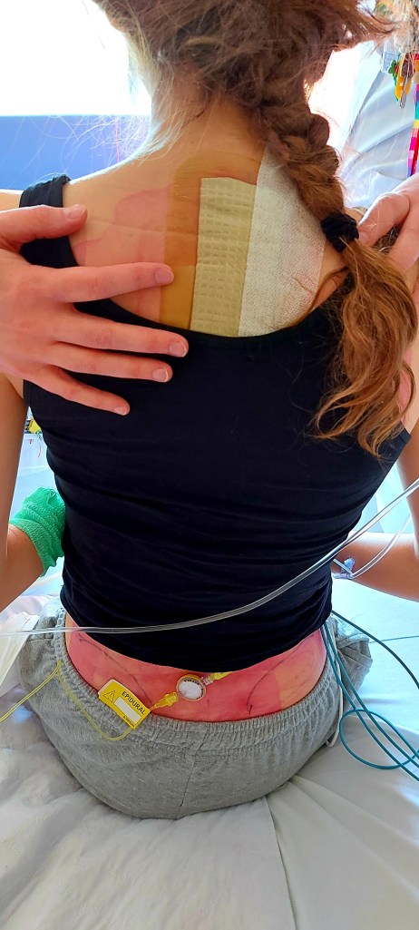 Ik keek de fotoβs terug van vorig jaar. In mijn gedachten had Eva weken alleen maar op de bank gelegen. Niet dus. Volgens de app mocht ze na twee tot zes weken weer kort naar school. Dat haalden wij net niet. Misschien ook wel omdat thuis school perfect ging (dankzij de COVID periode). De hele klas kwam een keer bij ons thuis op bezoek. Eva kreeg regelmatig visite van klasgenootjes. Deze periode had soms wel iets als Eva niet teveel pijn had. Samen heerlijk keuvelen.