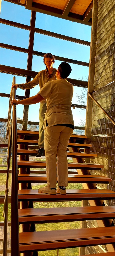 Eva moest op de afdeling van alles doen voordat ze naar huis mocht. Op bed rechtop zitten. Aan tafel zitten met eten. Douchen. Stukje lopen. Trap lopen. Alles de eerste keer was zo eng voor haar. Haar hoofd stond na de operatie anders op haar romp. Ik vergeet nooit de rit naar huis. Ik kreeg Eva de auto niet in. Ze kon niet bukken. Ik moest haar hoofd naar beneden duwen om haar in de auto te krijgen. Ze gilde het uit.