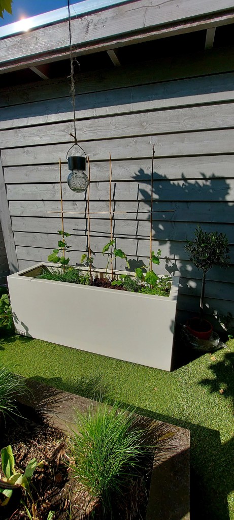 Ik vind het zo leuk om te kunnen plukken in mijn achtertuin. De Chinezen laten alles omhoog groeien. Scheelt weer ruimte. Ik heb vijf plantjes van een komkommer, snack komkommer en courgette. Stokken ernaast. Nog een stok halverwege horizontaal. Ik hoop zo dat ze het goed gaan doen. Ik probeerde het al om de boomstam heen te laten groeien. Dat werkte niet. Teveel schaduw.