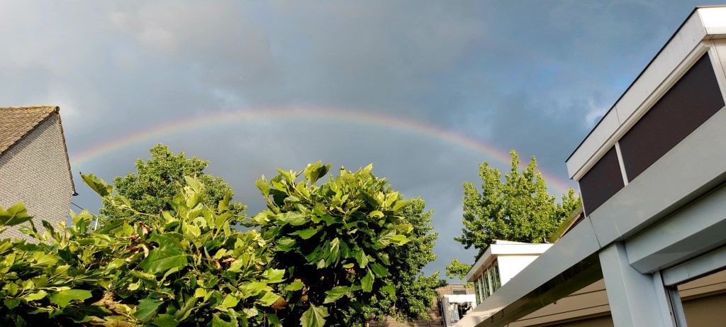 Ik zat in mijn stoel met zee achtergrond. Dolf op schoot. Op een gegeven moment regende het harder. Ik zag een regenboog.
