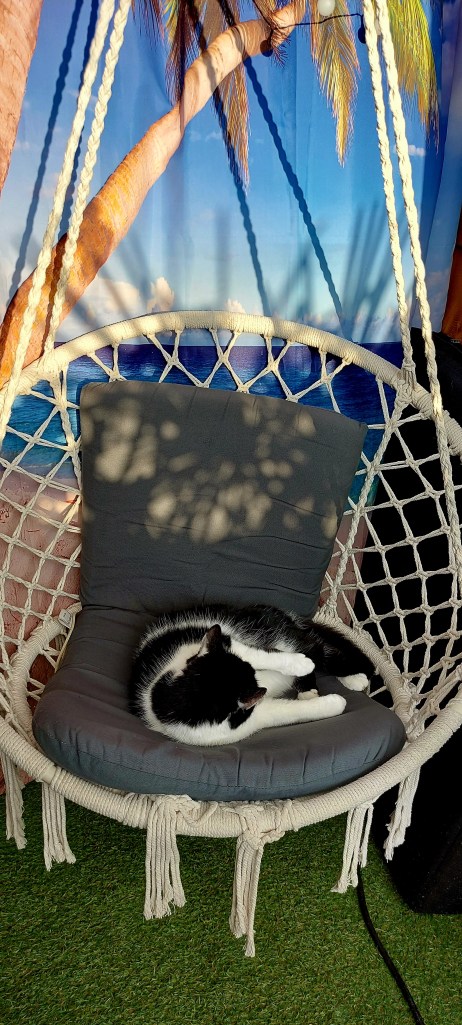 Prachtig om te zien. Heerlijk voor de tuin. Scheelt mij weer werk. En de moestuin van mijn broer is hier ook heel erg blij mee. Dolf pakte ik van mij schoot en legde ik in de schommelstoel. Ze bleef liggen. Heerlijk droog.