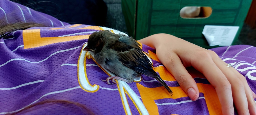 Gevangen met een handdoek. Fijn om te weten dat haar vleugels niet gebroken waren. Op internet gekeken naar een mus met een gebroken poot. Zij konden dit overleven…..