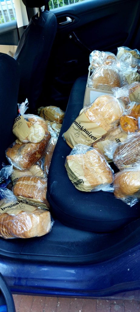 Dit lag in mijn auto. Ik heb de bakker enorm bedankt met de tekst; bedankt voor jullie gebak, daardoor kwamen fijne gesprekken op gang. Dankzij jullie brood zijn vele magen gevuld.