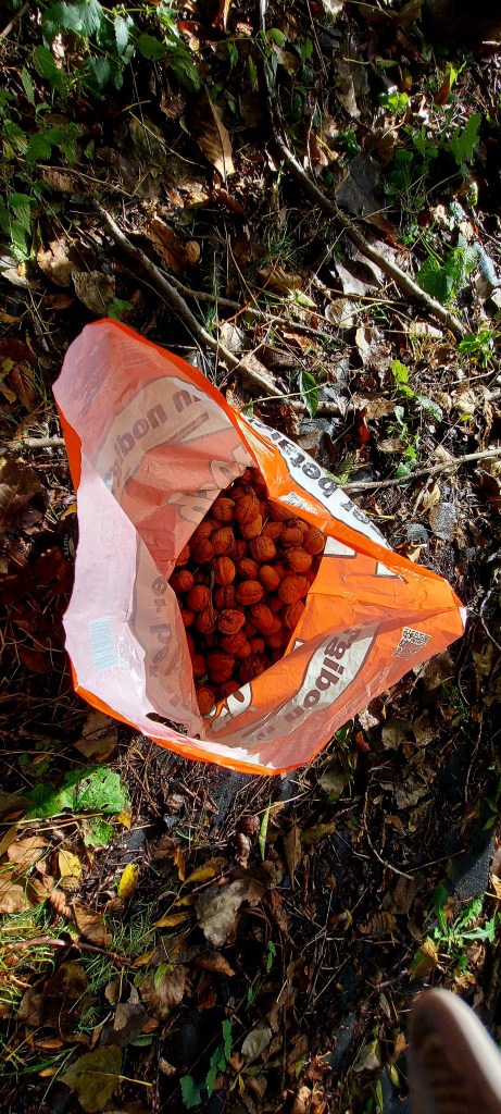 Op een gegeven moment gingen we met z’n allen walnoten zoeken. Nou ja, Corrie hield de tas vast en ik heb twee noten gevonden. De rest bloed fanatiek. Ik gilde weer eens omdat ik bijna een kikker aanraakte. Cor en ik moesten lachen. Wij zijn echte natuur mensen 😂. Lekker op je luie r..t buiten zitten en vooral niks doen. Al die beesten namen die voorbij kwamen zoals een bonte specht. Schiet mij maar lek. Ik herken geen een bijzonder vogeltje. Maar ja, de tas weer gevuld met walnoten. Die twee walnoten bomen zijn 14 en 15 jaar oud. De placenta van Daan en Eva na hun geboorte daar begraven en een walnoot boom erop gezet. Leuke herinnering. Ze doen het super.
