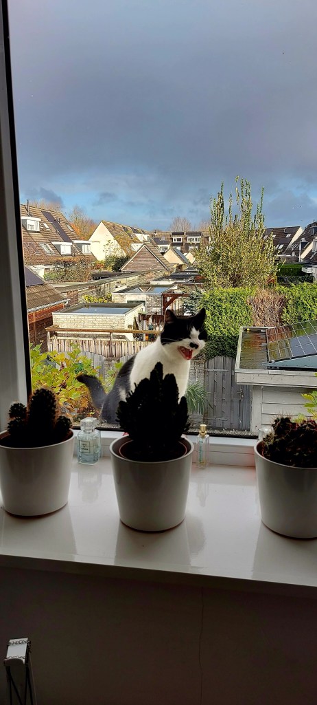Het klonk heel dichtbij dat gejank. Keek ik op de kamer van Eva 🤣. Zit mevrouw in de vensterbank. Ik rende naar beneden. Deur geopend. Ik riep Dolf. Een klap! Mevrouw sprong van de vensterbank op de overkapping. De volgende keer vliegt ze er doorheen. Pffff.