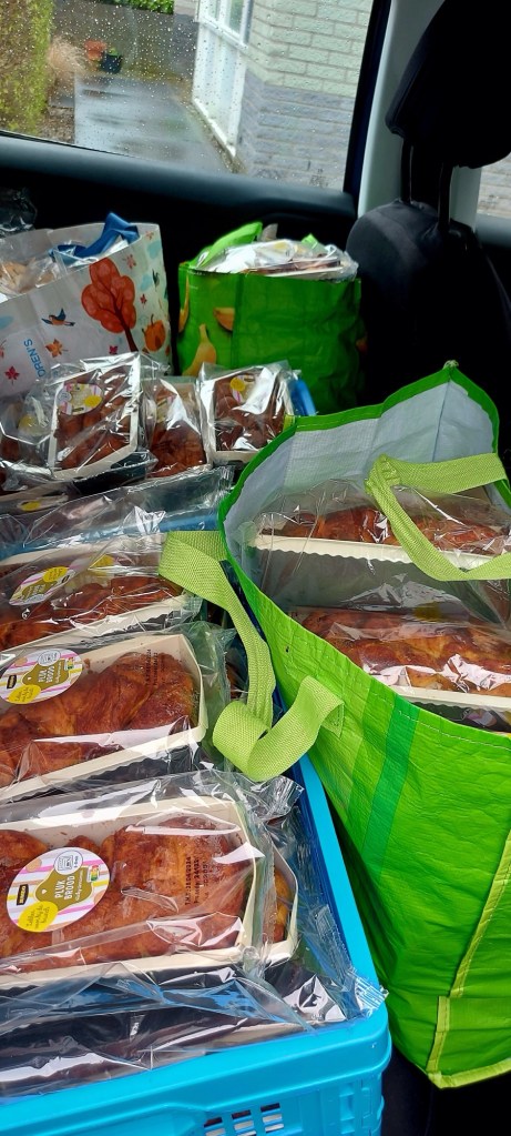 De volgende dag, vanmorgen, het brood naar de winkel gebracht. Weer terug naar de jumbo voor de rest. Dacht ik. Weer een auto vol. Dit naar flat gebouw thuis in zuid gebracht. Ik had het brood daar nog niet neergezet en het was al weg. Nog een lading paas stollen. Ook weg. De derde lading ging in hun buurtkast. Sommige dingen moest ik wel daar droppen. Anders zaten we met de datum als de winkel open zou zijn. En wij willen niks weg gooien.