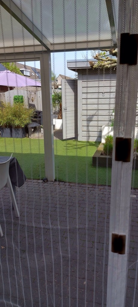Bij ons zijn zomerse geluiden onder andere het klikken van de hordeur. Omdat het vandaag al mooi weer was heb ik ze toch maar opgehangen. Vanmorgen nog niet. In no time vieze vliegen binnen. Mmmh. Het hor gordijn maar tevoorschijn gehaald.