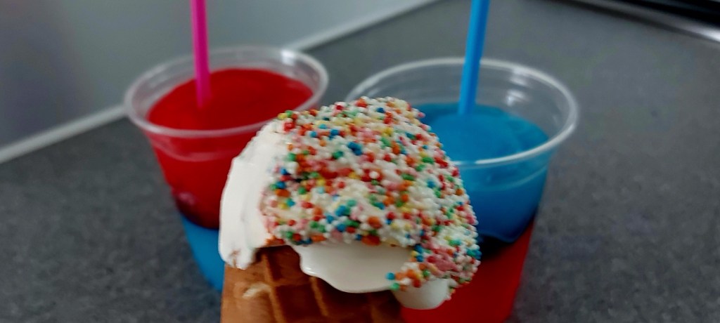 En als klap op de vuurpijl. De ijscoboer kwam begin avond langs. Voor Eva en vriendin een slush puppy. Daan wilde een softijs met disco dip.