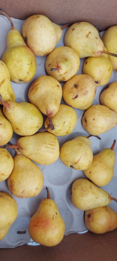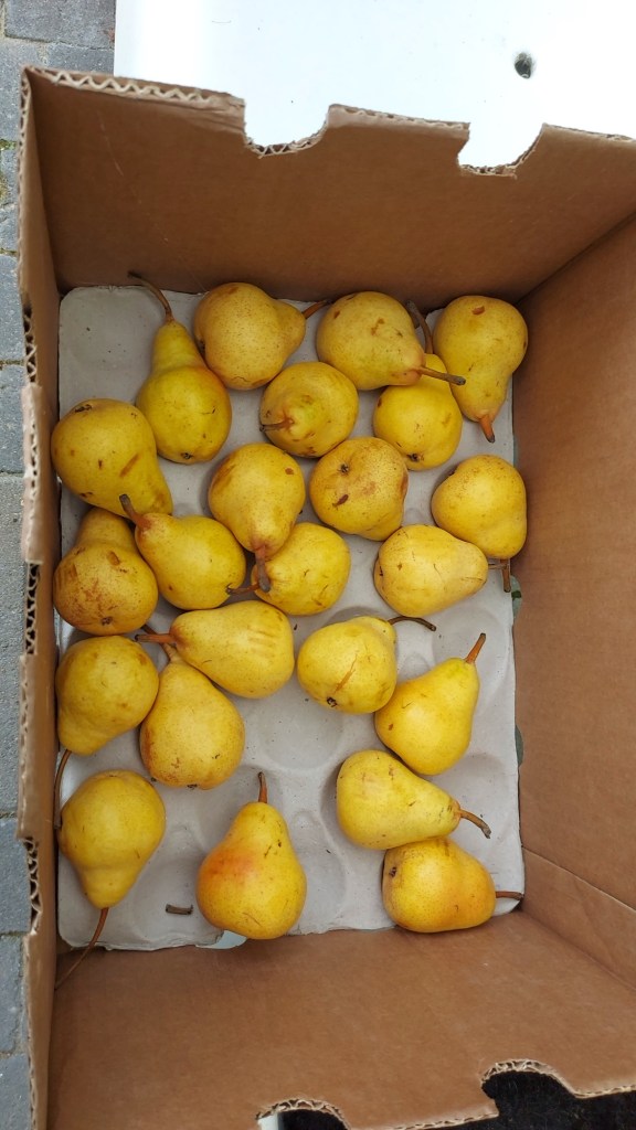 Ik kreeg van de oude basis school van Daan en Eva het schoolfruit ivm studie dagen. Geweldig toch? Sinaasappels en peren. Kleine handpeertjes. Ze zagen eruit als stoofperen. In het buurtkastje gelegd en bepaalde gezinnen aan geschreven.