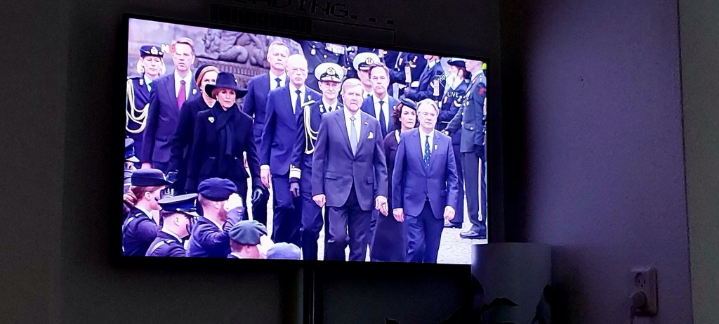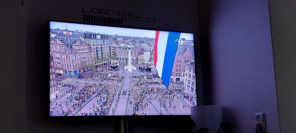 19:45 zaten Daan, Eva en ik voor de buis. Wij gingen voor de twee minuten stilte. Ik zet dan altijd de voordeur open. Binnen en buiten stilte. Daarna hees ik samen met Daan de vlag. Vier de bevrijding.