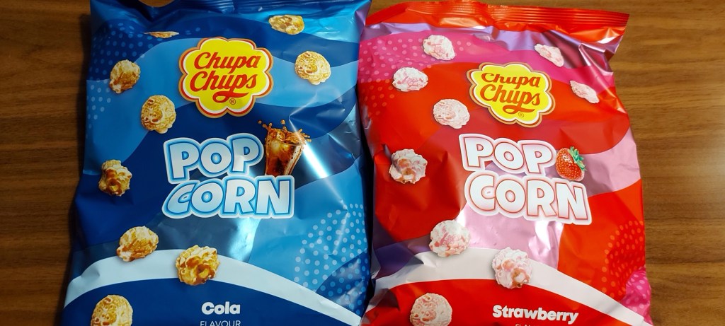 De popcorn gekocht. In de aanbieding. Cola smaak en aardbei. Wij waren sceptisch.