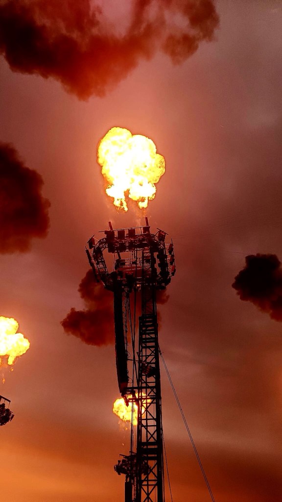 Wij stonden niet vooraan. Ergens halverwege. Dichtbij de installatie in het midden. Als het vuur aan ging…. Pfew, wat een hitte. Je zal vooraan hebben gestaan.