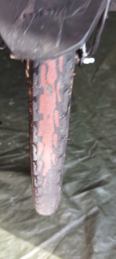 Van de week zag ik ipv een een zwarte rubber band iets roods. Dat lijkt niet goed. Het wiel is aan het verslijten. Ik verwacht snel een klapband.