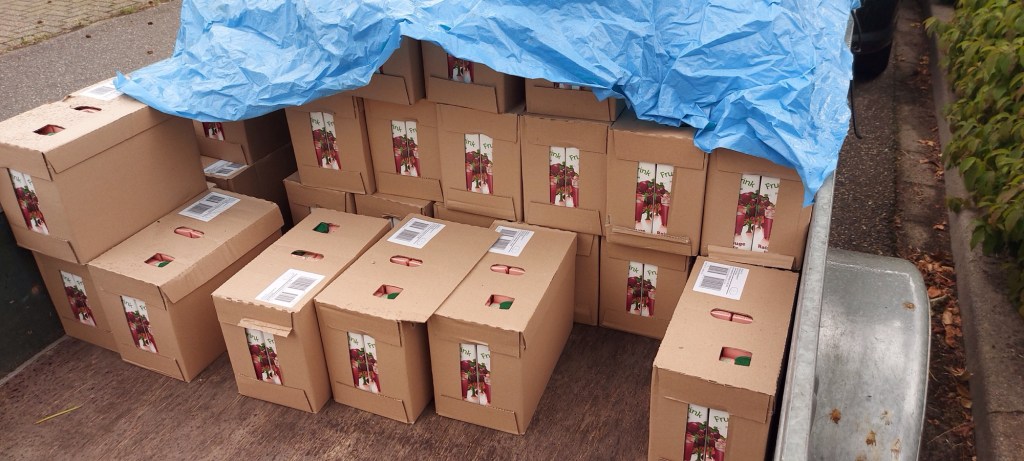 Nu maakt iets over de datum niks uit. Maar hoe krijg ik zoveel pakken sap hier en of in de winkel? Mijn lieve vader regelde een kar. Wij gingen voor duizend pakken sap. Pfew. Wat een klus. In de kar ging nog. Een meneer van dat bedrijf was zeer behulpzaam. Hij zorgde dat de heftruck op een goeie hoogte zat zodat wij onze ruggen niet hoefden te belasten.