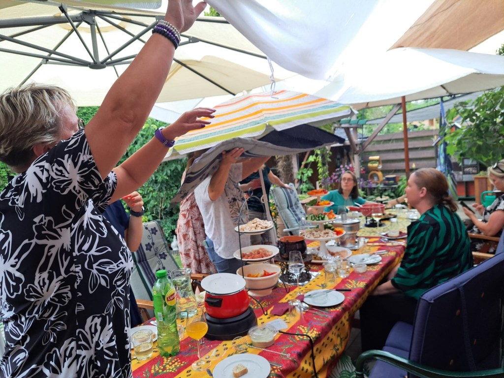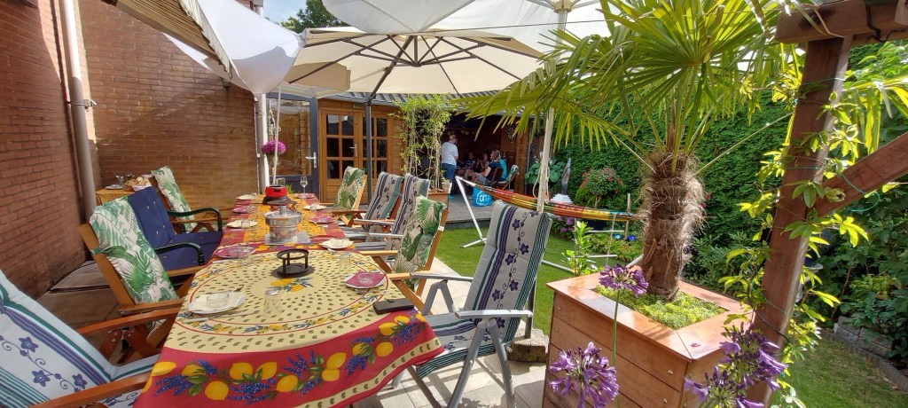 Bij de eerste bui bleven wij zitten. Bij bui nummer twee, weer gekeken naar buienradar, er ging wel wat vallen, de boel ingepakt. Hop naar binnen. Zo gebeurd met z’n allen.