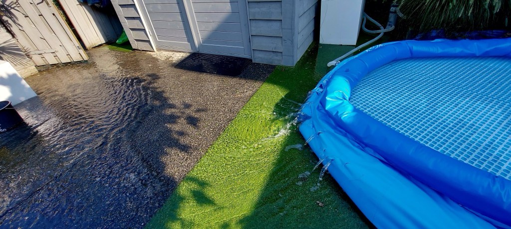 Waarom maak ik het zwembad stuk? Opslag is een ding. En ik heb gemerkt dat het bad het tweede jaar met veel zon uitgerekt raakt. Dan wordt het bad lager en breder.