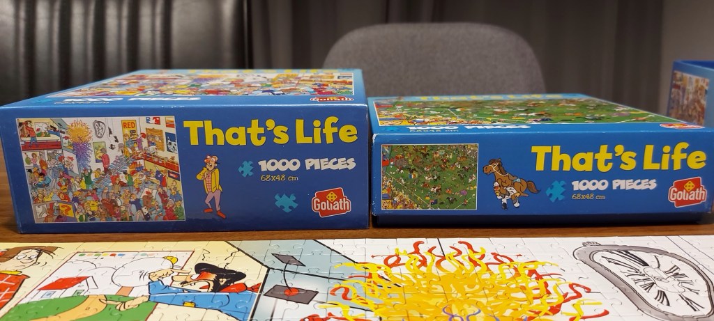 Kijk toch eens naar het verschil van de dozen waar de puzzels in liggen. Bizar toch? Links was. Rechts is nu.