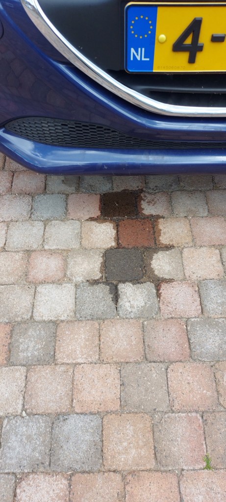 Vanmorgen naar mijn vader gegaan. Trouwdag van pa en ma. Lastige dag. Mooie bloemen en wat lekkers gebracht. Kom ik thuis. Zie ik een olievlek op mijn nieuwe oprit. Lekker dan. Auto snel aan de weg gezet. Steentjes van de oprit maar een keer omdraaien.