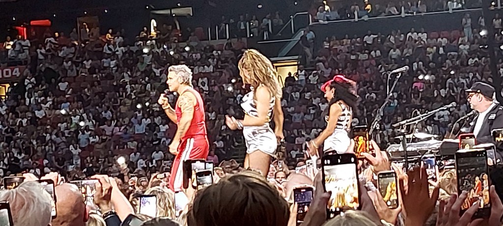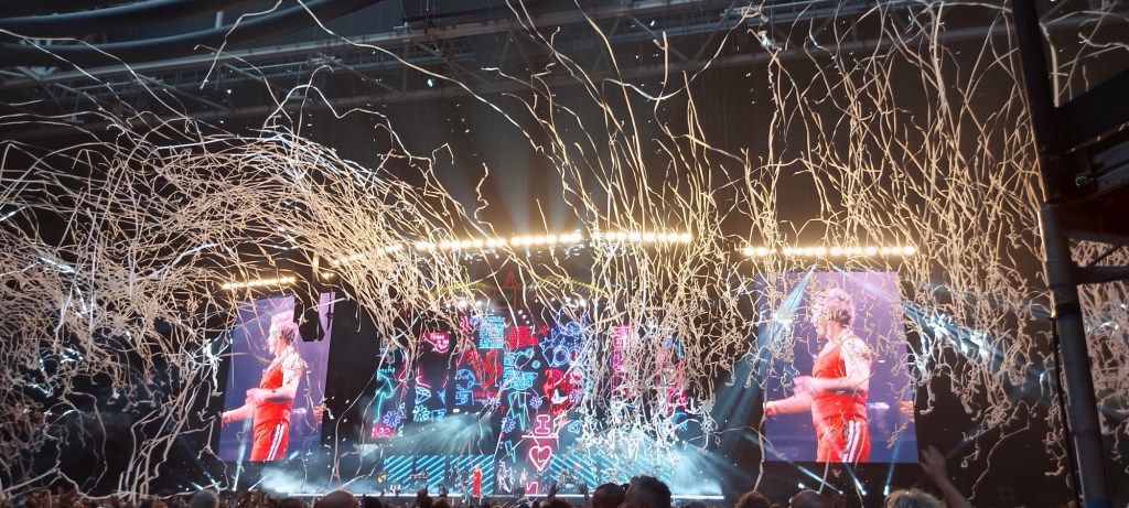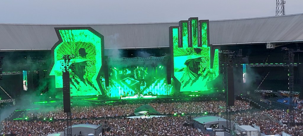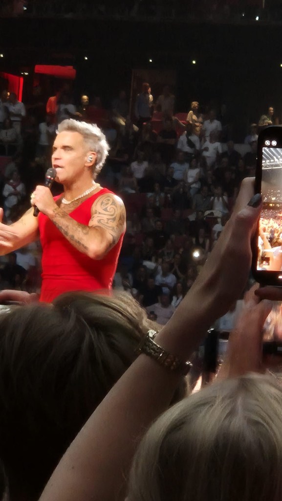 Inmiddels dat festival leven weer opgepakt. Bij Direct genoot ik al enorm. Wat is dat een band! Echt te gek. Daarna Robbie Williams. Heerlijke show. Wij stonden per ongeluk vooraan. Was niet de bedoeling. Maar toen wij de arena binnen liepen, was er nog bijna niemand. Ach, dan blijf je lekker vooraan staan. Kwam hij ook nog eens voor ons langsgelopen. Alle liedjes kenden wij. Dat is altijd leuk. De kaartjes regelt mijn vriendin steeds. Voor niks of voor een prikkie. Anders werd het mij te duur.