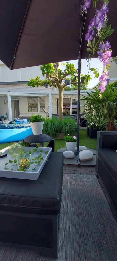 Ik heb alles maar in hun groene kliko gegooid. Dan is die helaas niet leeg als zij thuis komen. Maar ik heb voor weinig super leuke plantjes gescoord. De tuin heerlijk opgepimpt. In dezelfde kleuren die zij hiervoor ook hadden. Deze mensen doen genoeg voor mij. Nu kan ik iets terug doen.