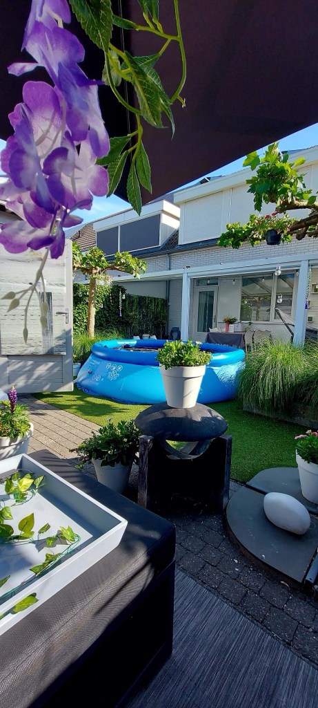 Zaterdag was de langste dag. En ook nog eens het beste weer. Lekker warm. Geen muggen. Overdag had ik twee jongetjes te zwemmen. Meestal komt een van de twee hier. Prima. Zo gezellig. Als hij snoepjes mee heeft zegt hij steeds: jij mag er ook wel een hoor. Te lief. Gisteren kwam hij met een vriendje. Oepsie. Twee jongens…. Ik dacht dat er oorlog in de tuin was.