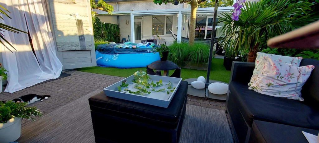 Ze gaven vandaag aan dat er waarschijnlijk geen hittegolf komt in verband met koele wind. Jammer. Ik wil zolang mogelijk buiten zitten. Het is namelijk weekend! Ik weet alleen niet of er op dit moment al muggen zijn in de avond. Zo ja…. Dan wordt dat buiten zitten al minder leuk. Tenzij je in een warm zwembad ligt. De verwarming van het bad heb ik nog niet aangezet. Omdat de nachten nog koud waren vond ik dat zonde van de energie.