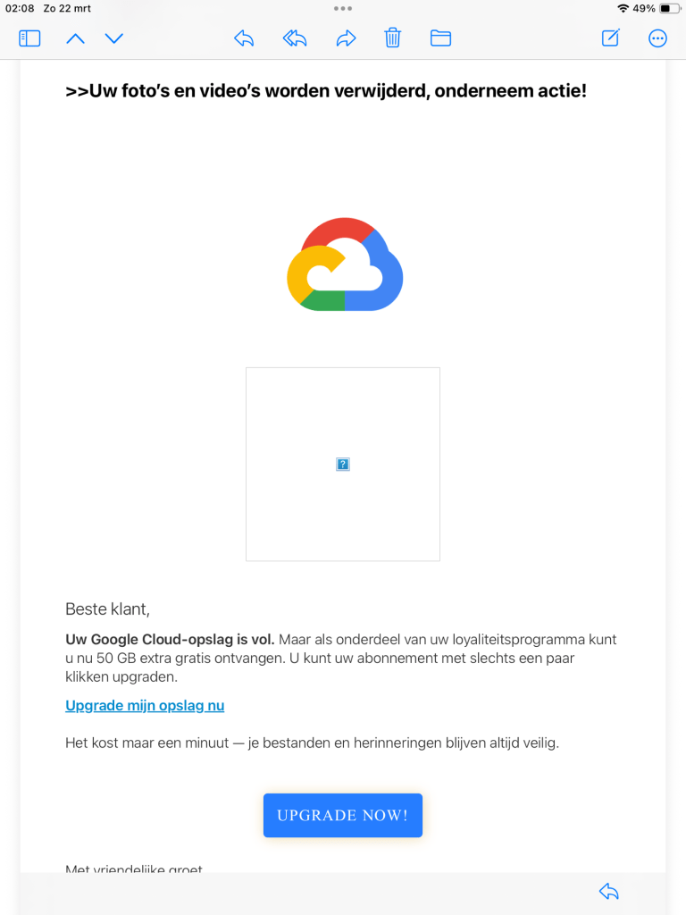 Ik kreeg in januari an een bericht dat mijn ICloud vol zou zijn. Mail, foto’s etc etc zouden verwijderd gaan worden. Ik had nog twee maanden de tijd. Na vier weken weer een bericht.