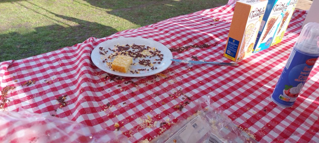 Kindjes kregen een plak cake. Met slagroom en verschillende sprinkels. De kids zag je genieten. Mogen wij een gebakje bij u halen?
